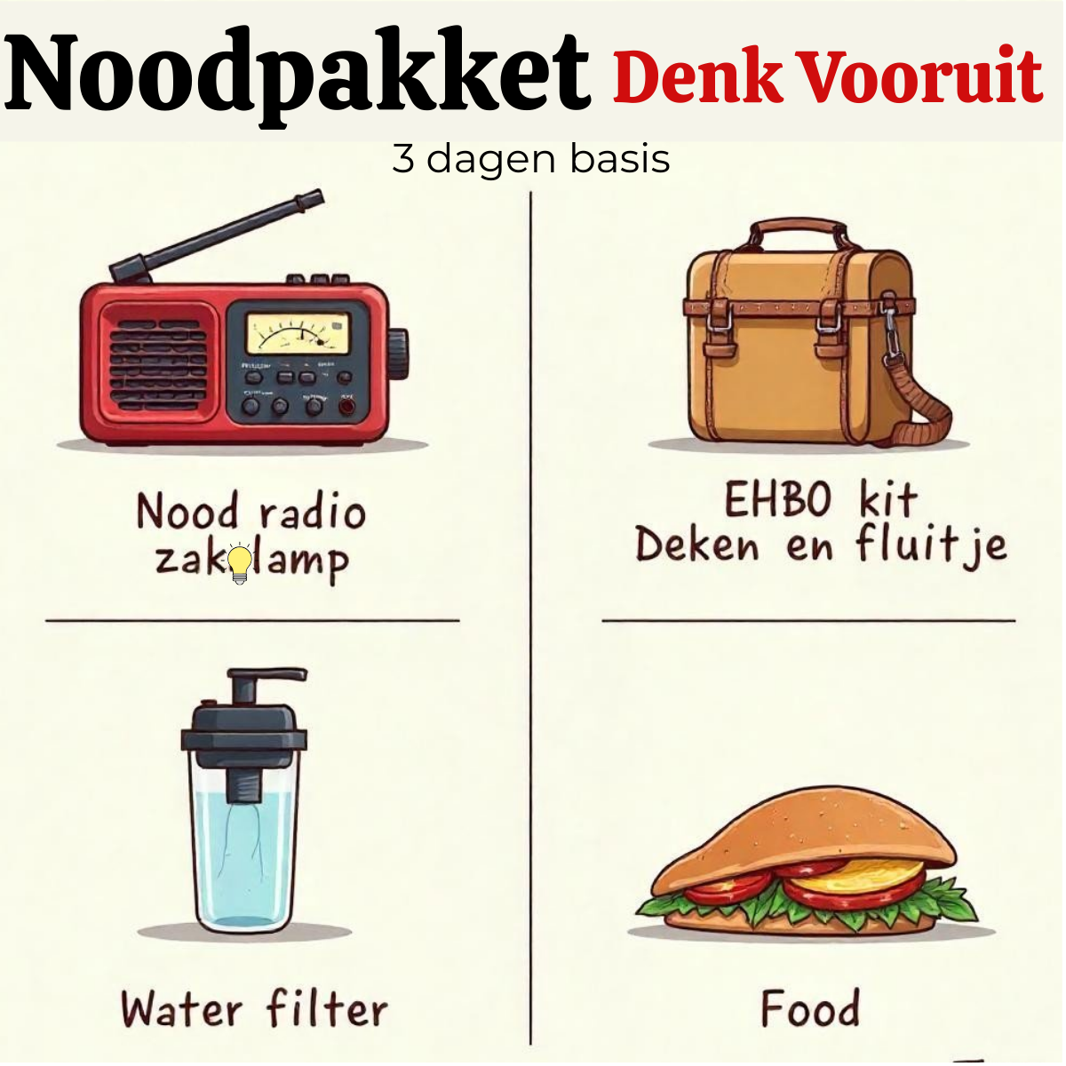 Een noodpakket moet de basis hebben voor minimaal 72 uur, inclusief water (3 liter per persoon per dag), lang houdbaar voedsel, een EHBO-set, communicatiemiddelen (batterij-radio, powerbank), verlichting (zaklamp, batterijen), dekens, hygiëneproducten, contant geld, kopieën van belangrijke documenten, reservesleutels, een fluitje en een EHBO-doos. Het is belangrijk om deze spullen op een handige plaats te bewaren en elk half jaar de houdbaarheid te controleren, aldus